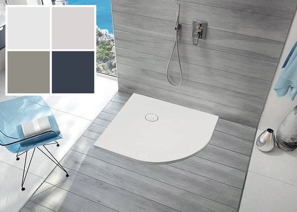 Čtvrtkruhová sprchová vanička se sifonem 80x80 a 90x90 cm o hloubce 1,5 cm. S protiskluzem i bez. Barvy: bílá, mléčně šedá, šedá břidlice, šedý kámen.