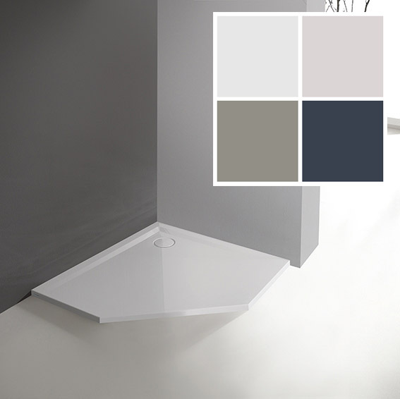 Pětiúhelníková sprchová vanička z litého mramoru v rozměru 90x90 a 100x100 cm. Vanička je doplněna sifonem s krytkou. S protiskluzem i bezprotiskluzu. Barvy: bílá, mléčně šedá, šedá břidlice, šedý kámen.