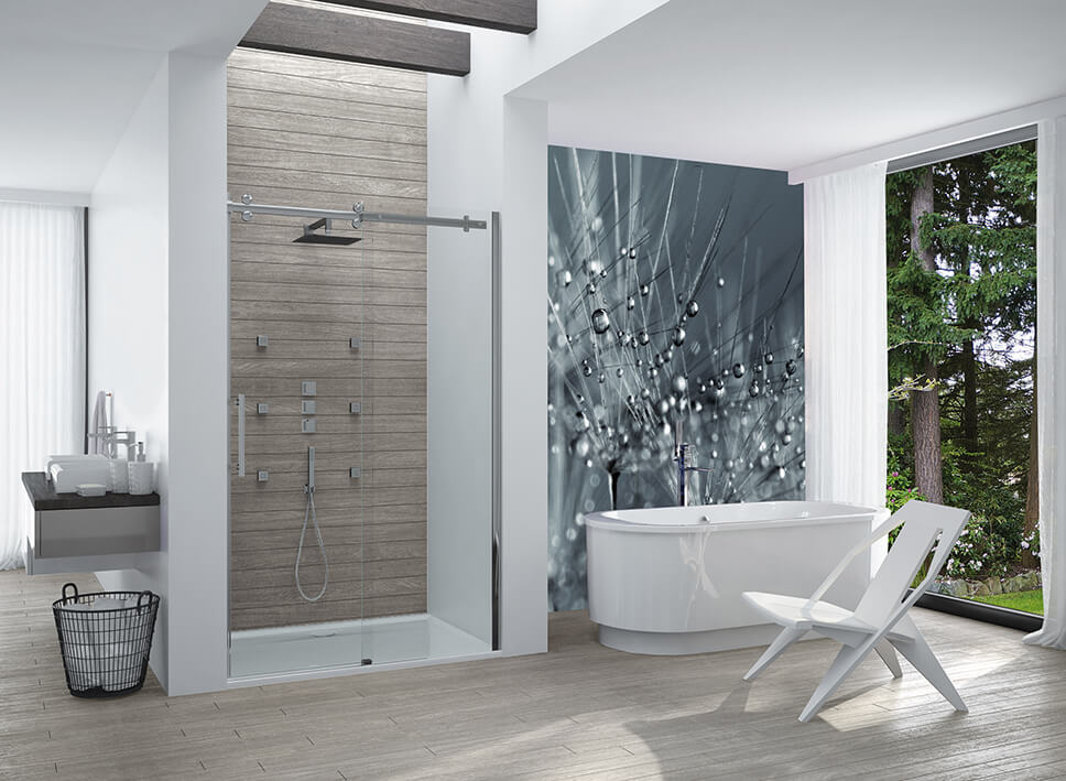 Posuvné sprchové dveře se hodí pro niky v šířkách od 110 do 200 cm. Na výběr 2 typy skel: čiré a graphit. Tiché a bezproblémové otevírání zajišťují masivní pojezdy se zvýšeným průměrem a pevností. Lze vyrobit na míru.